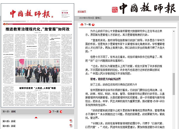 本次论坛以“深化教育领域‘放管服’改革,推进教育治理现代化”为主题,发布了《中国教育政策建议书》(2019年版)、《中国教育黄皮书》(2019年版)、《长江教育论丛》等系列研究成果,以及长江教育研究院连续四年独家研制推出的《中国教育指数》(2019年版)和《2019年十大教育关键词》。在论坛研讨环节,韦法云结合研究中心前期研究成果,作了《放得下、管得住、服好务》的发言,提出了高等学校管理的“标准化”建设和加快“放管服”试点的建议,在论坛产生积极反响,并受到与会主流媒体的关注。3月6日《中国教师报》头版“两会直通车”专栏发表“推进教育治理现代化,“放管服”如何改》,报道了韦法云发言的部分观点,《中国教育新闻网》予以转载。