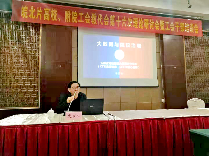 会议邀请我校工会主席、安徽省高校管理大数据研究中心主任兼首席专家韦法云作了《大数据与院校治理》的报告。报告从院校发展定位和发展规划、校院两级管理、资源配置三方面,阐述了大数据理论和思维、作用机理以及发挥的作用,并从大数据的视角,提出了对联系观、矛盾观和发展观新的认识。